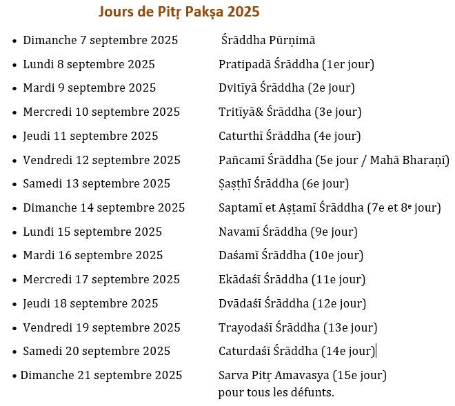 Pitṛ pakṣa est une période rituelle dédiée aux ancêtres, pendant laquelle sont célébrés les rites appelés Śrāddha et Tarpana. Ces pratiques, accomplies avec foi et sincérité, effacent les fautes et libèrent du cycle des renaissances. Elles constituent une marque de vénération et de gratitude envers les membres défunts de la famille et les ancêtres lointains. Pitṛ pakṣa débute le jour de la pleine lune du mois de Bhadrapadha et se termine le dernier jour de la quinzaine sombre du mois de Asvina.