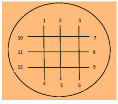 Placez devant vous votre thālī et disposez à l’intérieur 3 herbes verticalement, et trois autres horizontalement, comme indiqué sur ce schéma :
